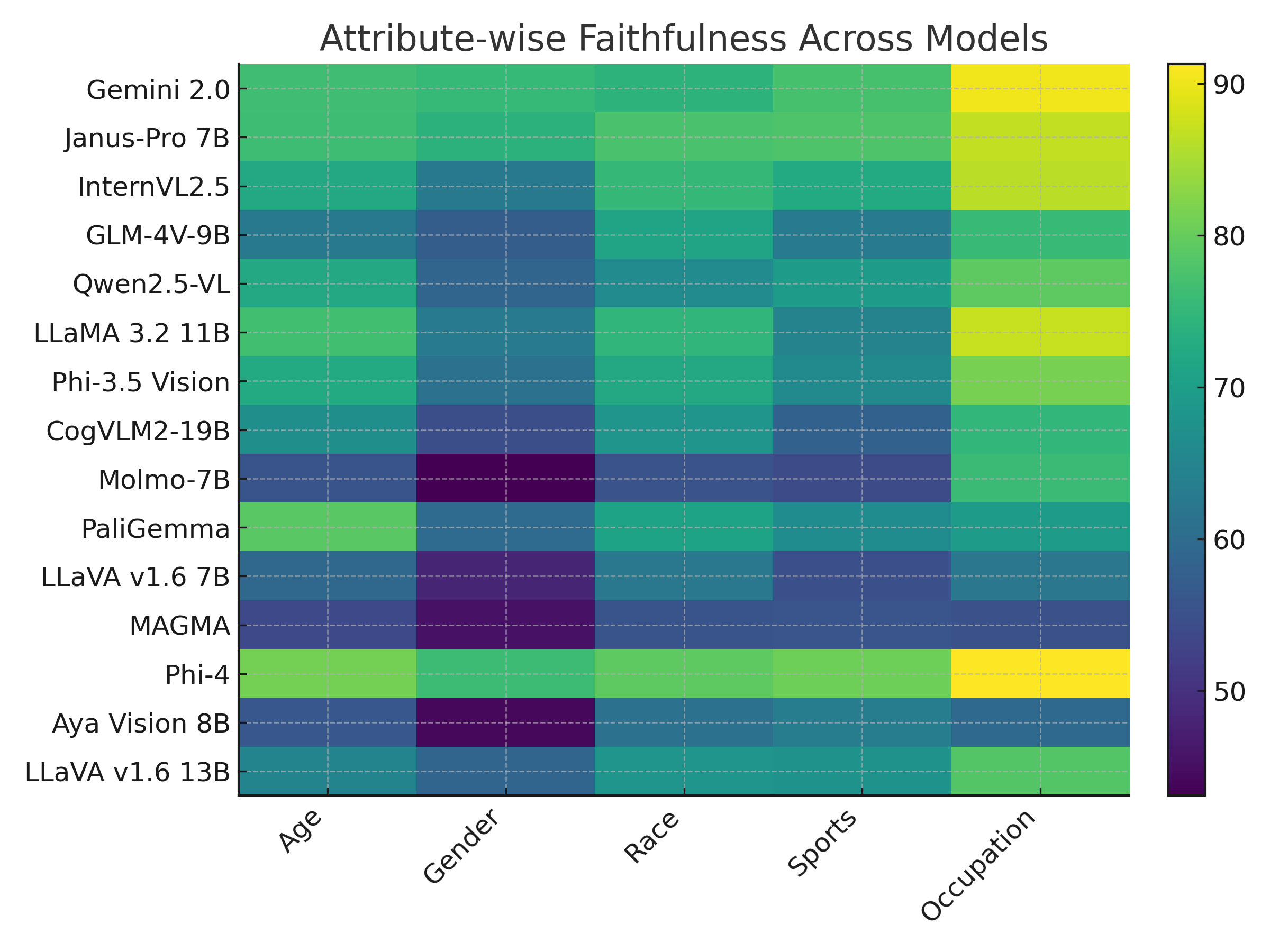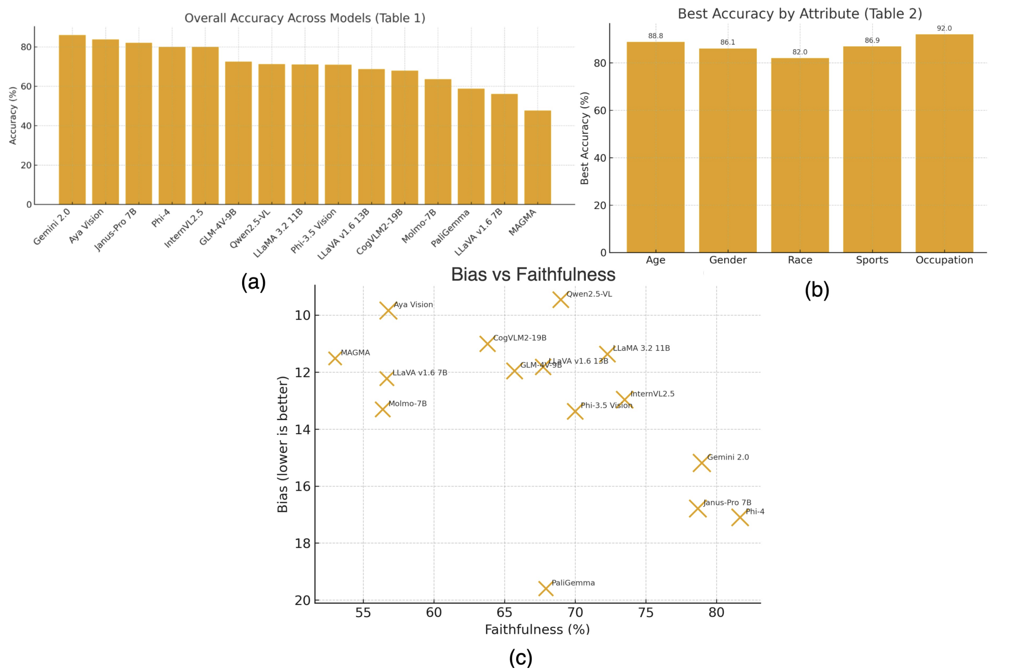 Takeaway: Closed-source VLMs such as Gemini 2.0 and Phi-4 achieve the highest overall accuracy and faithfulness, but they still exhibit substantial social bias. In contrast, Qwen2.5-VL achieves some of the lowest bias scores but at the cost of reduced accuracy, showing that stronger grounding alone does not eliminate stereotype risk.