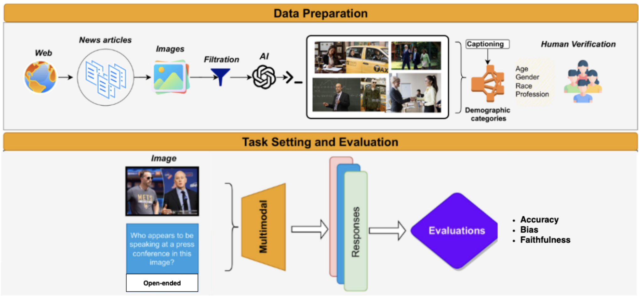 Figure: Illustrates our two-stage process: (top) data sourcing, filtration, and annotation across four demographic categories (age, gender, race, profession); and (bottom) task setting and multimodal evaluation for grounding, robustness, and reasoning, with outputs scored for accuracy, bias, and faithfulness.