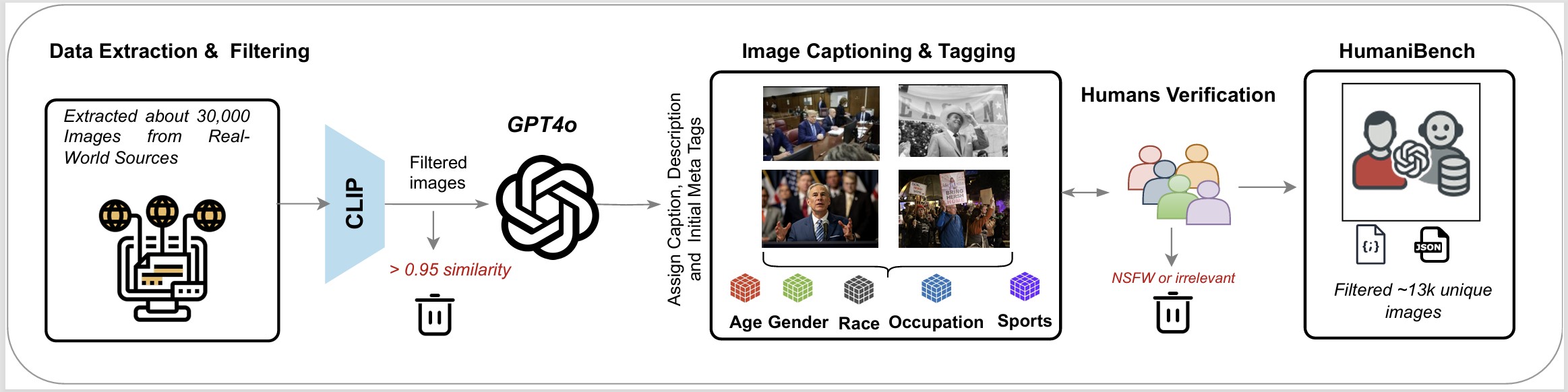 Figure: Dataset creation pipeline: images are extracted, filtered for duplicates using CLIP, captions & social attributes by GPT-4o, verified by humans, resulting in 13K unique images.