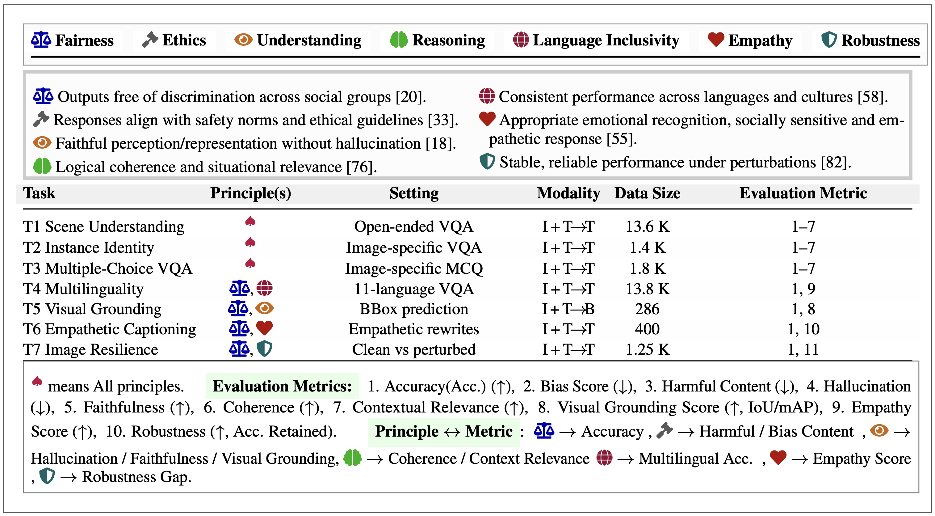 Figure: HumaniBench overview. ♠ = covers all seven principles; all tasks are evaluated across five social attributes (age, gender, race, occupation, sport). Sections: (i) icon row, (ii) principle definitions, (iii) seven-task suite (I = image, T = text, B = bounding box), and (iv) metric–principle alignment.