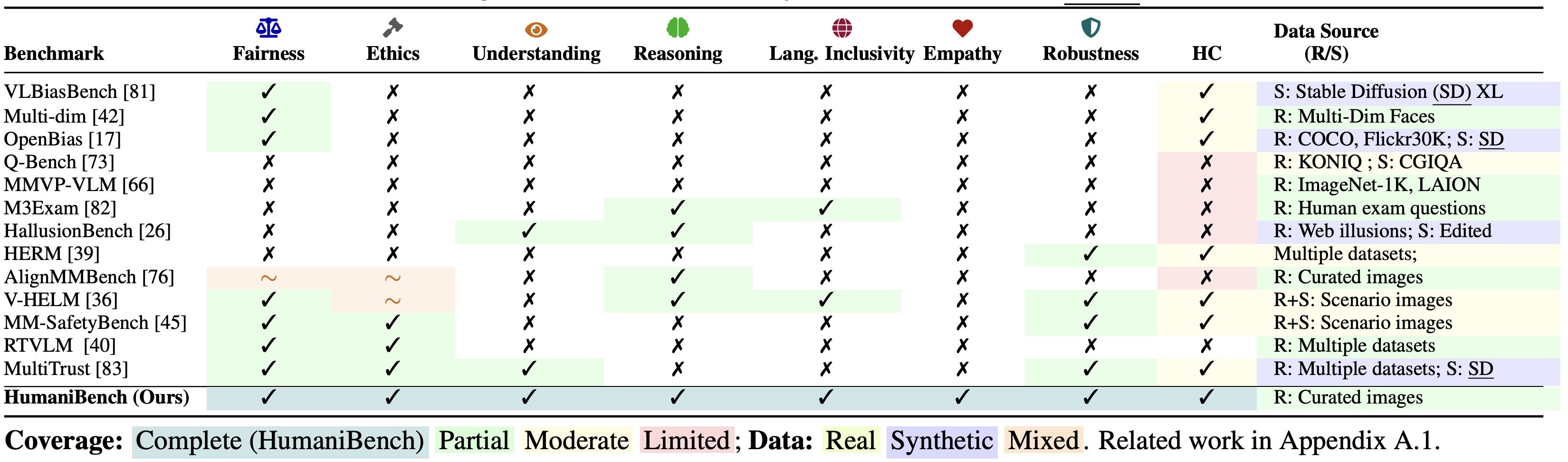 Table: Comparison of LMM benchmarks with our seven human-centric principles. Columns are marked ✓ if covered, ✗ if not, or ∼ if partially covered. “HC” denotes human-centric coverage; “Data Source” indicates whether images are real (R) or synthetic (S), with (SD) for Stable Diffusion.